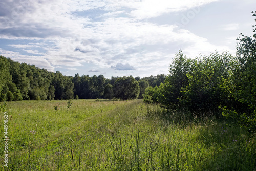 © moskvich1977, Fototapeta premium Forest and meadow in summer on a clear day
