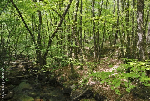 © Heliosphile, Obraz premium Forest and rocs in Brittany
