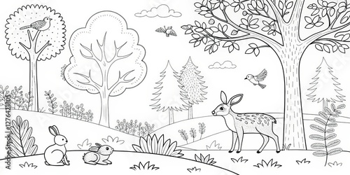 Fototapeta premium Forest Animals Coloring Page Line Art, Black and White, Cute Bunnies and Deer, Spring, Nature, Birds Keywords Coloring Book, Illustration