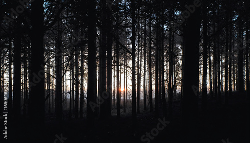© TJantunen, Fototapeta premium Forest at Dusk with Sunburst