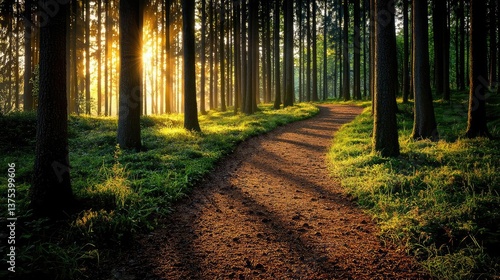 © Thamonchanok, Obraz premium Forest at sunset rays illuminate serene pathway in twilight concept. A serene forest pathway illuminated by soft sunlight.