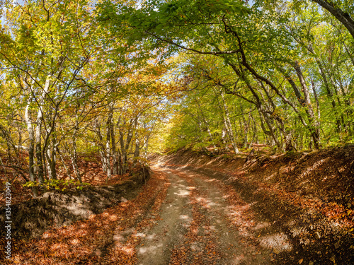 Fototapeta premium Forest autumn dirt road under the arches of trees.