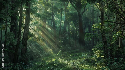 Fototapeta premium Forest Background: A dense forest provides a rich, textured background with towering trees, lush underbrush, and dappled sunlight filtering through the canopy