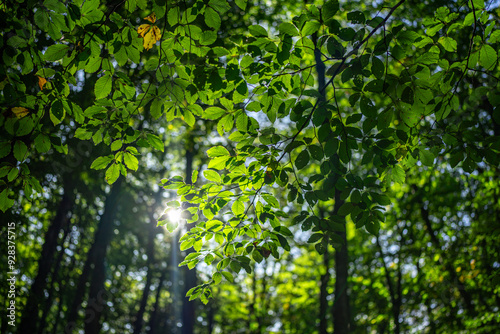 © Volodymyr, Obraz premium Forest background. Green leaf backdrop. Nature leaf background. Green leaf forest greenery background. Green in forest. Green plants backdrop. Nature leaf on greenery blurred.