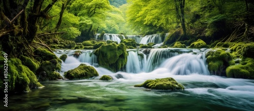 Fototapeta premium Forest background with a tranquil stream, perfect for your design with copy space image.