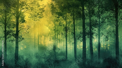 Fototapeta premium Forest background with tree silhouettes and misty atmosphere in green and yellow colors