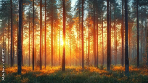 Obraz premium Forest bathed in warm sunlight, trees reaching upward