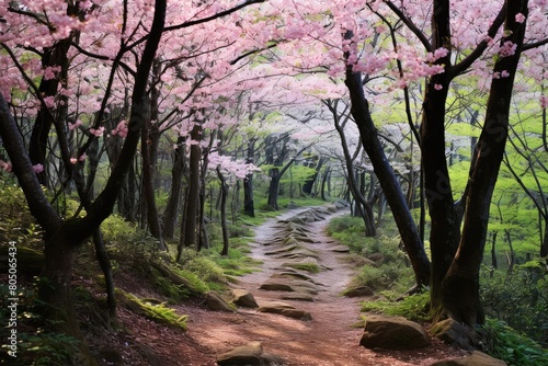 © OhmArt, Obraz premium Forest Bathing Trail: A trail designed for Shinrin-yoku (forest bathing) with cherry trees.
