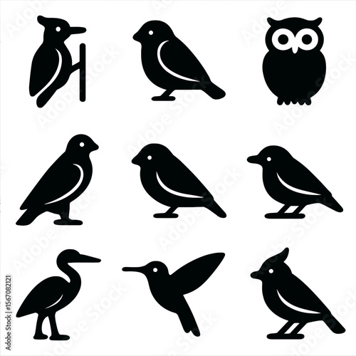 Obraz premium Forest Bird Icons. Solid, filled icon set of forest birds: woodpecker, sparrow, owl, hawk, finch, warbler, heron, hummingbird, jay