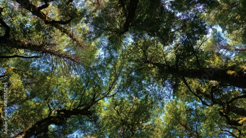 Obraz premium Forest canopy from below, leaves rustling in the breeze and sky peeking...