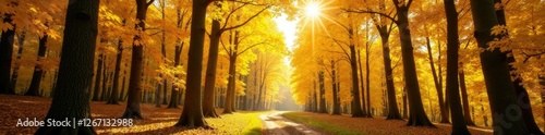 Fototapeta premium Forest canopy of golden aspen trees with dappled sunlight filtering through, natural light, woodland scene, forest