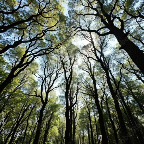 © Prapasarabhron, Obraz premium Forest canopy with eucalyptus trees and sunlight filtering, atmosphere, forest