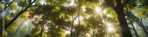 Fototapeta premium Forest canopy with sunlight filtering through leaves, forest canopy, natural beauty , forest ecosystem