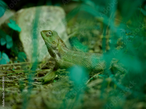 © Neeraj, Fototapeta premium Forest Chameleon lying on grass field at natural environment.