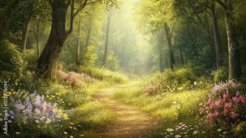 © OlgaNeuroArt, Obraz premium Forest clearing with sunlit trees and flowers