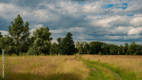 Obraz premium Forest, clouds, meadow and dirt road.