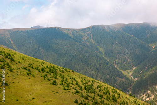 © senerdagasan, Fototapeta premium Forest covered mountain range and valley with clouds