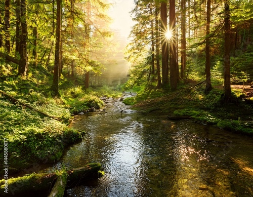 Obraz premium forest creek in warm sunlight