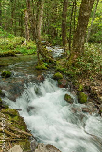 Obraz premium Forest creek, lush green woodland in Kamikochi, Nagano, Japan