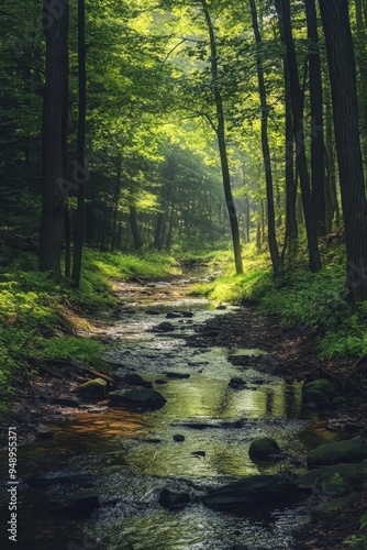 Obraz premium Forest creek with sunlight filtering through the trees.