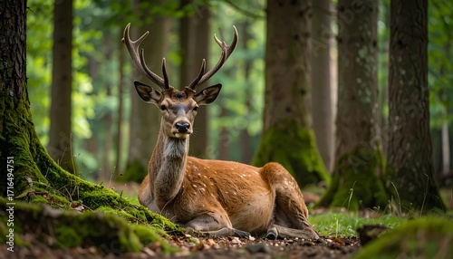 © Rian, Naklejka premium Forest deer resting in mossy undergrowth