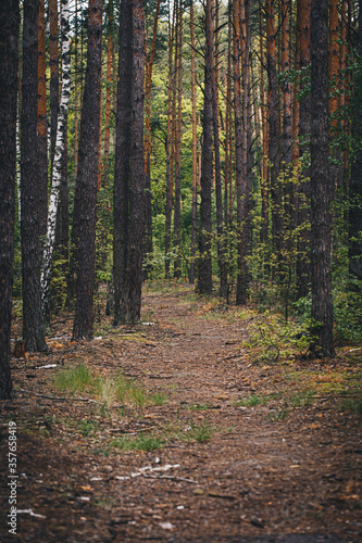 © Mykola Sushkov, Fototapeta premium Forest dirt road among pines and birches