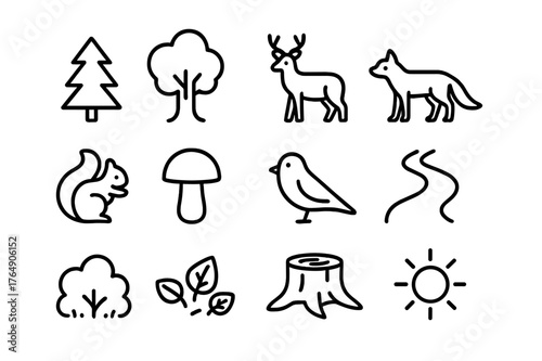 Obraz premium Forest Ecosystem Icons. Forest ecosystem. Line icon set of forest ecosystem: pine tree, oak tree, deer, fox, squirrel, mushroom, bird, river, bush, fallen