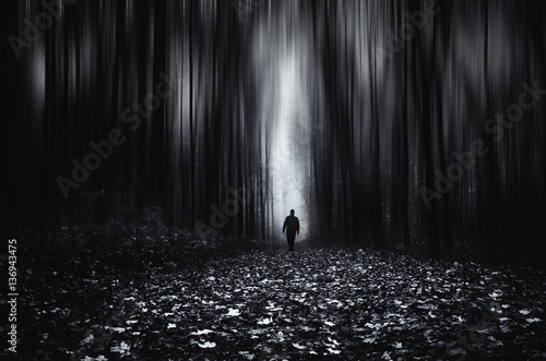 Obraz premium Forest fantasy landscape. Man in spooky forest at night, motion blur effect
