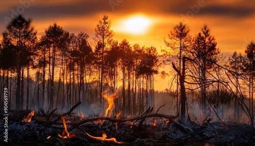 Fototapeta premium Forest Fire at Sunset: Nature's Destructive Beauty