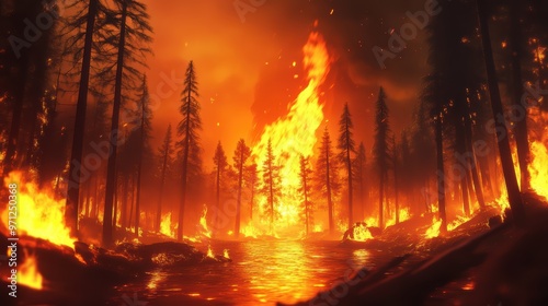 © Natawut, Naklejka premium Forest Fire Burning with River in Foreground