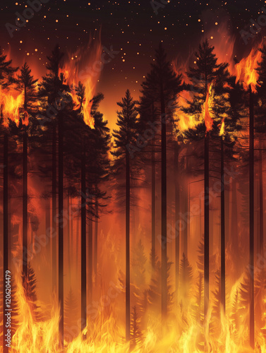 Fototapeta premium Forest fire disaster illustration, trees burning at night, wildfire nature destruction, damaged environment caused by global warming