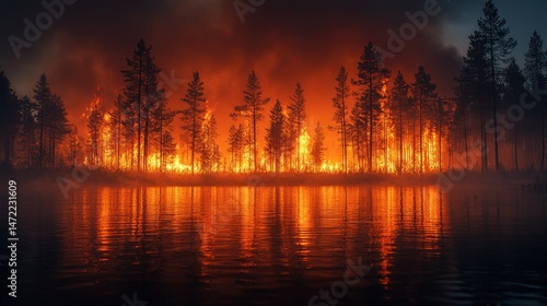 © Karmimbar, Fototapeta premium Forest fire raging near lake