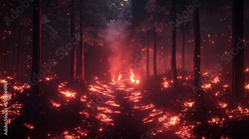 Naklejka premium Forest fire scene showing a path covered in flames surrounded by trees in the...