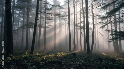 Naklejka premium Forest floor bathed in soft morning light fog slowly clears, scenery,...
