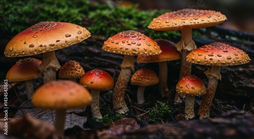 Obraz premium Forest Floor Fungi: A Cluster of Wild Mushrooms - Symbiotic growth, autumnal...