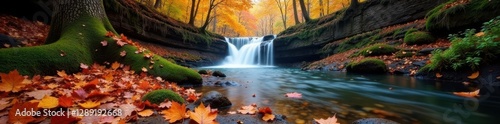 © Manae, Obraz premium Forest floor with fallen leaves and waterfalls, autumn, waterfall