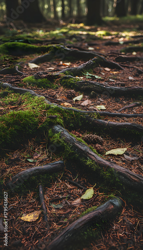 Fototapeta premium Forest floor with moss-covered tree roots and fallen leaves