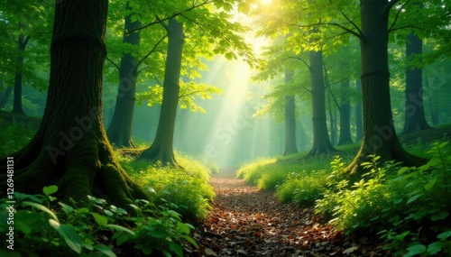 © chaiwat, Naklejka premium Forest floor with sunlight filtered through leafy canopy, dappled light, natural ambiance, natural wonder