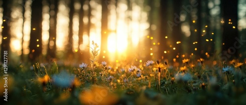 Naklejka premium forest flowers at sunset with fireflies