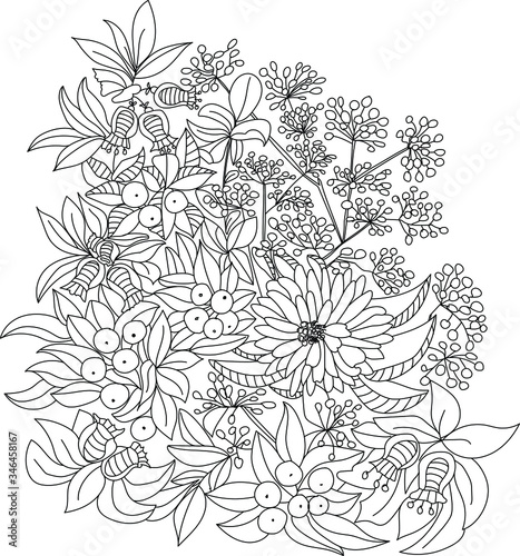 © Ольга Дубровина, Fototapeta premium Forest flowers, leaves and berries. Beautiful bouquet. Vector coloring book for adults and children. Hand drawn illustration. Floral ornament is good for web, print and stencil