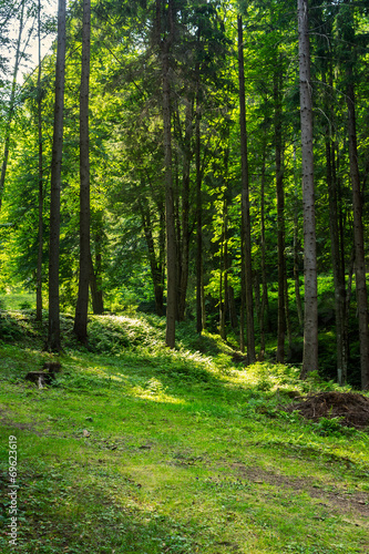 © Pellinni, Fototapeta premium forest glade in shade of the trees at sunrise