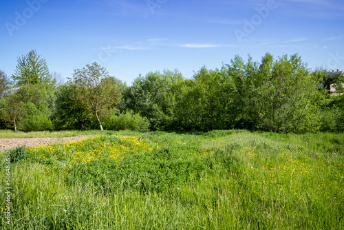 © Наталія Богодіца, Obraz premium forest glade with birches, meadow flowers outside the village