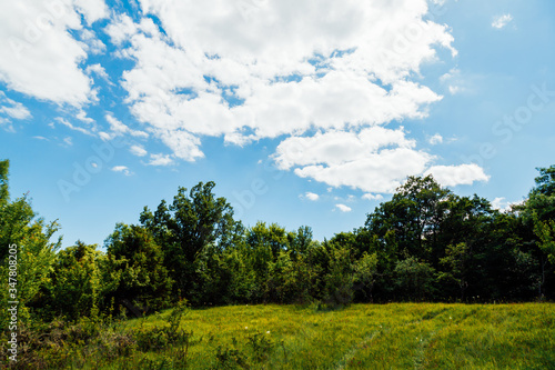 © dmitriisimakov, Fototapeta premium forest green blue sky and clouds its beautiful
