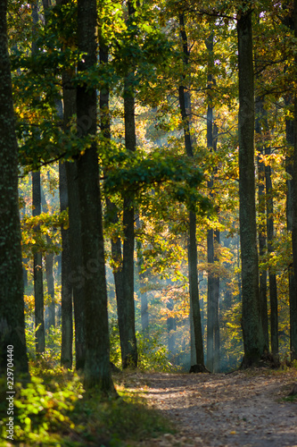 © Valeriia, Fototapeta premium Forest. Green trees in the forest. Green and yellow leaves on a tree