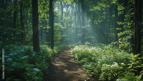 Obraz premium Forest hiking trails with dappled sunlight, serene and inviting, Nature, Soft greens, Photograph, Woodland walk