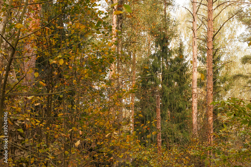 Fototapeta premium Forest in autumn. Pine trees. Birch trees.