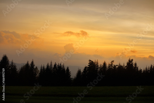 © Anna Averianova, Fototapeta premium Forest in mountains at sunset