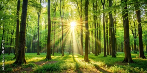 Naklejka premium Forest in spring with bright sunlight filtering through trees, spring, nature, spring, nature, natural beauty
