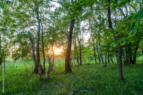 Naklejka premium Forest in summer colors. Green colored deciduous trees in golden sunlight....