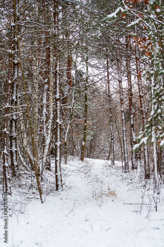 © daily_creativity, Naklejka premium Forest in the winter. Trees covered with white fluff and snow. A heavy snowfall.